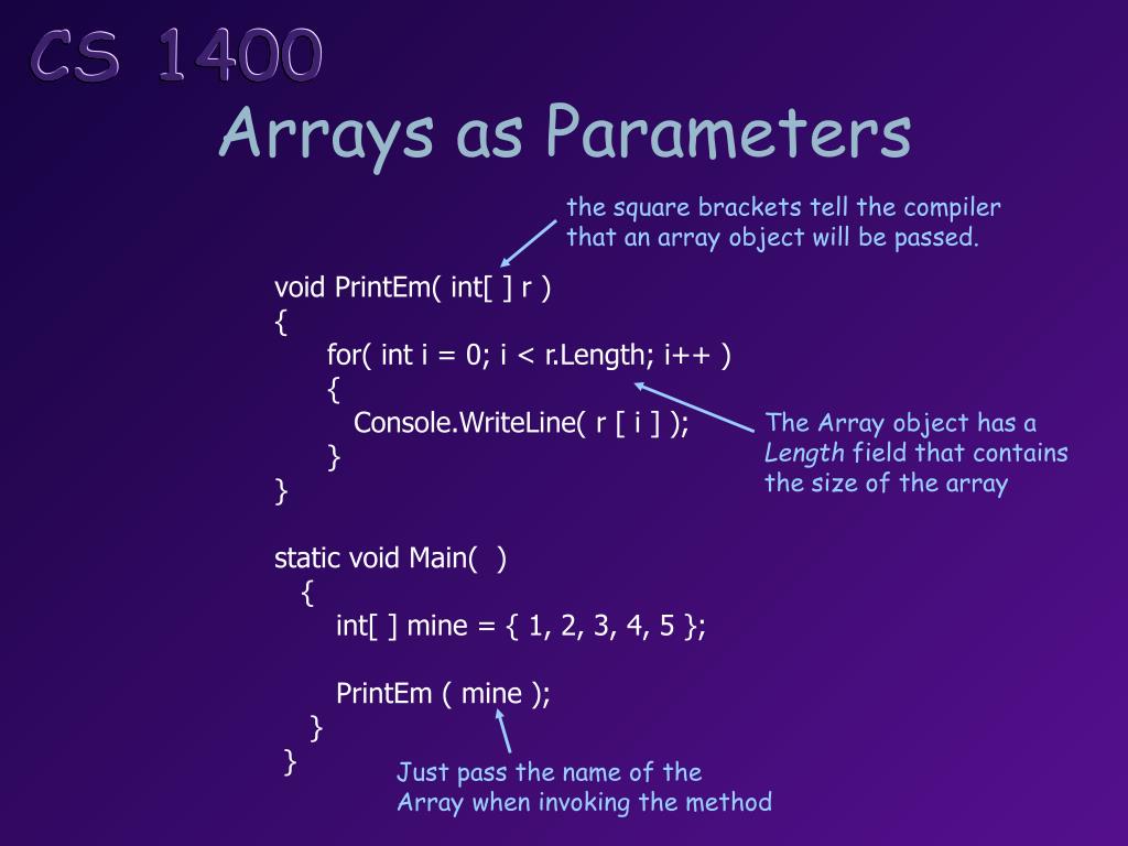 Arrays as Parameters the square brackets tell the compiler that an array object will be passed. void PrintEm( int[ ] r ) { for( inti = 0; i < r.Length; i++ ) { Console.WriteLine( r [ i ] ); } } static void Main( ) { int[ ] mine = { 1, 2, 3, 4, 5 }; PrintEm( mine ); } } The Array object has a Length field that contains the size of the array Just pass the name of the Array when invoking the method