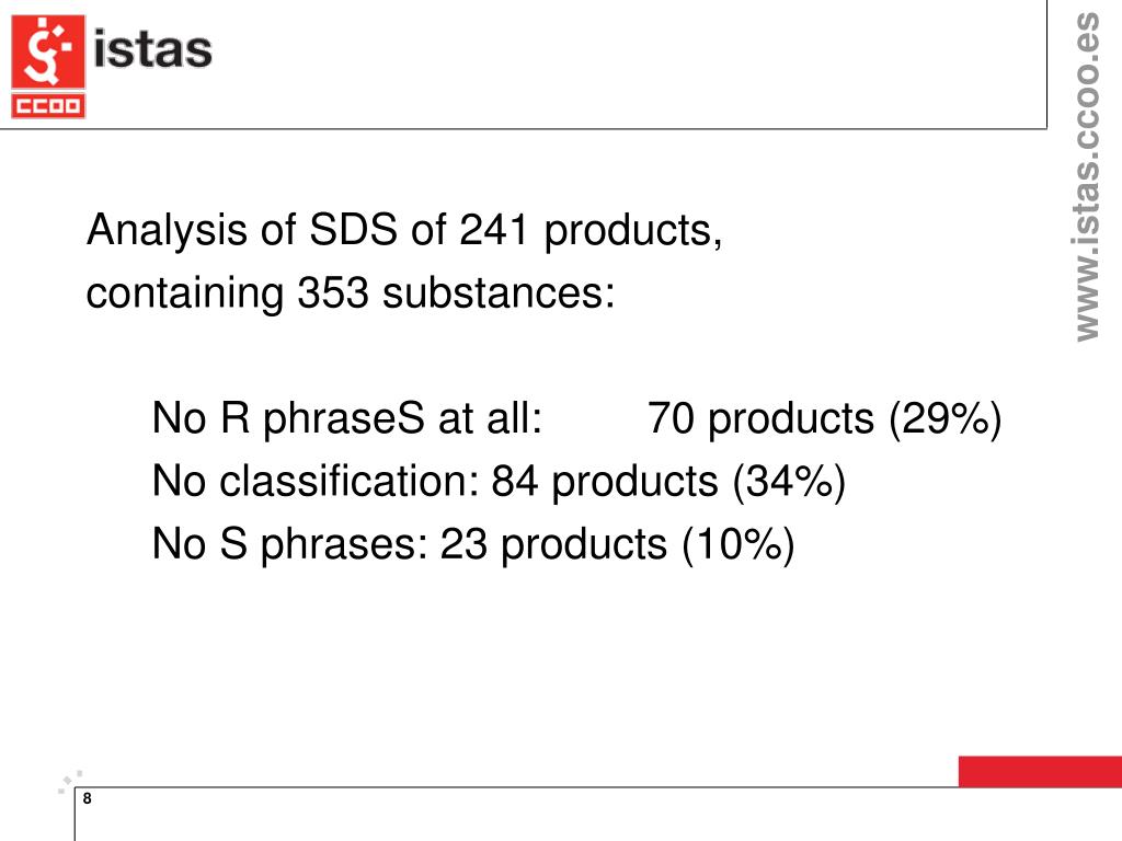 Analysis of SDS of 241 products, containing 353 substances: No R phraseS at all: 70 products (29%) No classification: 84 products (34%) No S phrases: 23 products (10%)