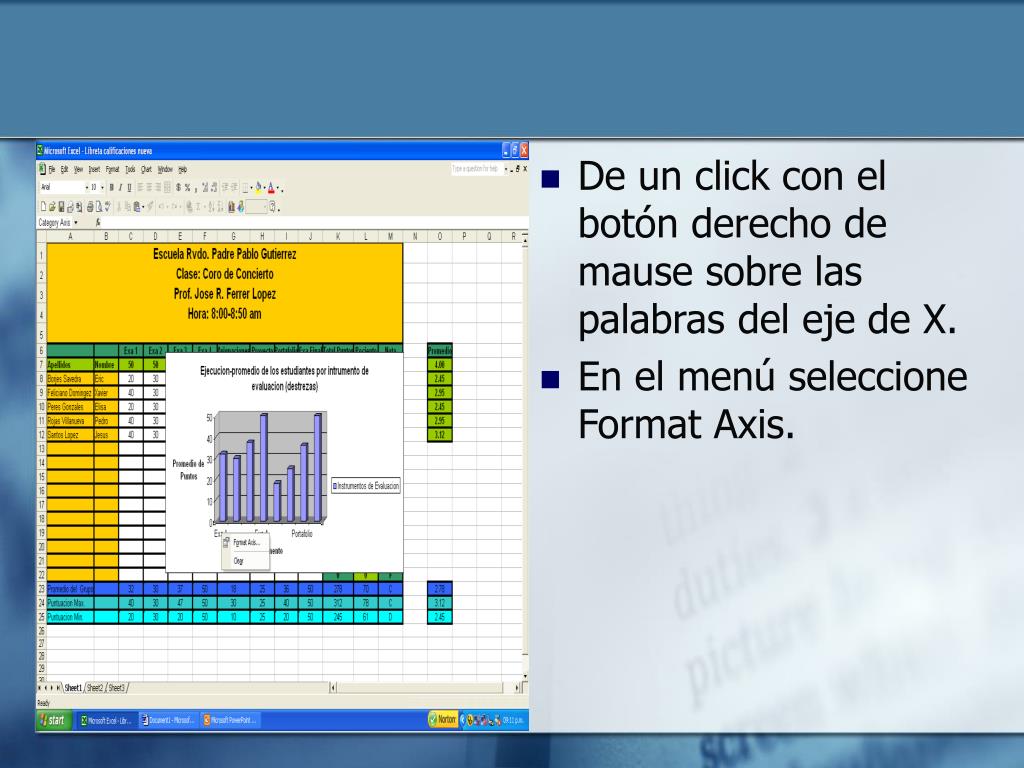 De un click con el botón derecho de mause sobre las palabras del eje de X. En el menú seleccione Format Axis.