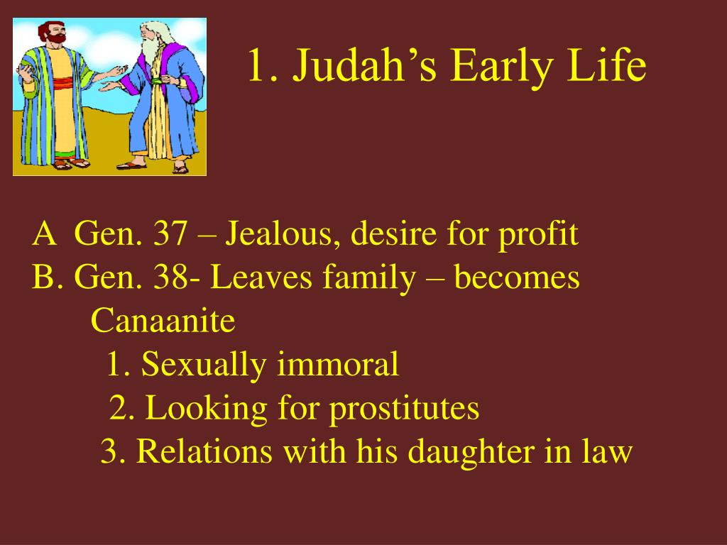 1. Judah’s Early Life A Gen. 37 – Jealous, desire for profit B. Gen. 38- Leaves family – becomes Canaanite 1. Sexually immoral 2. Looking for prostitutes 3. Relations with his daughter in law