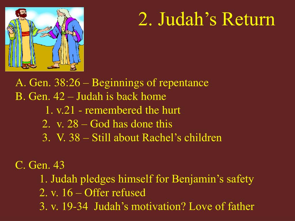2. Judah’s Return A. Gen. 38:26 – Beginnings of repentance B. Gen. 42 – Judah is back home 1. v.21 - remembered the hurt 2. v. 28 – God has done this 3. V. 38 – Still about Rachel’s children C. Gen. 43 1. Judah pledges himself for Benjamin’s safety 2. v. 16 – Offer refused 3. v. 19-34 Judah’s motivation? Love of father