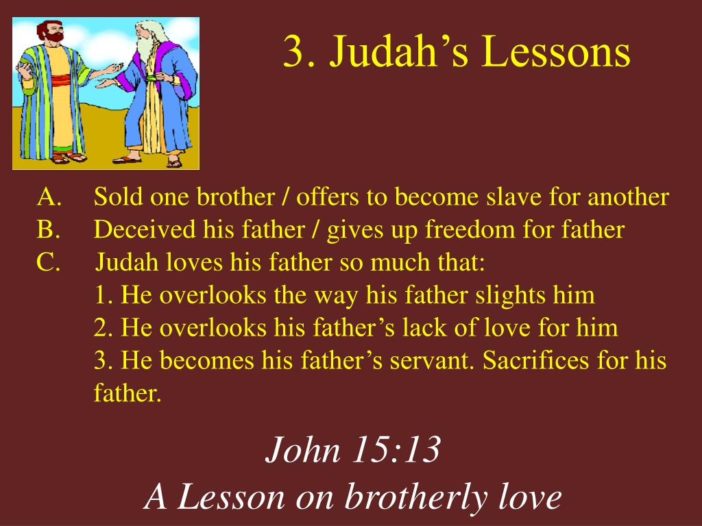 3. Judah’s Lessons Sold one brother / offers to become slave for another Deceived his father / gives up freedom for father C. Judah loves his father so much that: 1. He overlooks the way his father slights him 2. He overlooks his father’s lack of love for him 3. He becomes his father’s servant. Sacrifices for his father. John 15:13 A Lesson on brotherly love