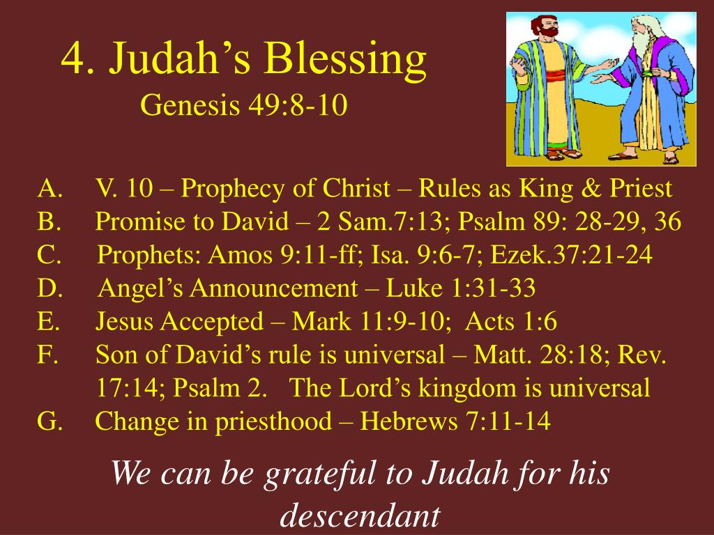 4. Judah’s Blessing Genesis 49:8-10 V. 10 – Prophecy of Christ – Rules as King & Priest Promise to David – 2 Sam.7:13; Psalm 89: 28-29, 36 C. Prophets: Amos 9:11-ff; Isa. 9:6-7; Ezek.37:21-24 D. Angel’s Announcement – Luke 1:31-33 E. Jesus Accepted – Mark 11:9-10; Acts 1:6 Son of David’s rule is universal – Matt. 28:18; Rev. 17:14; Psalm 2. The Lord’s kingdom is universal Change in priesthood – Hebrews 7:11-14 We can be grateful to Judah for his descendant