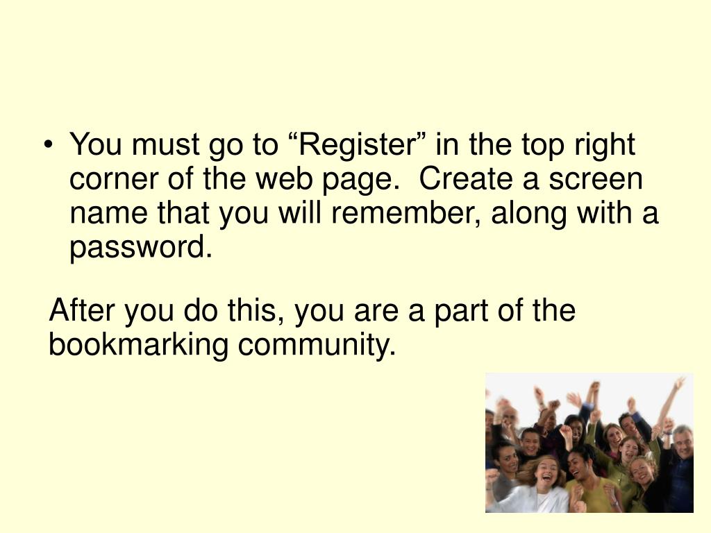 You must go to “Register” in the top right corner of the web page. Create a screen name that you will remember, along with a password. After you do this, you are a part of the bookmarking community.