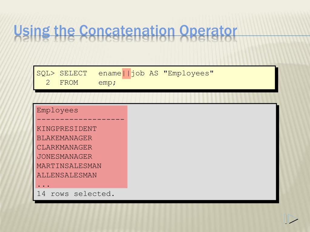 Using the Concatenation Operator SQL> SELECT ename||job AS "Employees" 2 FROM emp; Employees ------------------- KINGPRESIDENT BLAKEMANAGER CLARKMANAGER JONESMANAGER MARTINSALESMAN ALLENSALESMAN ... 14 rows selected.