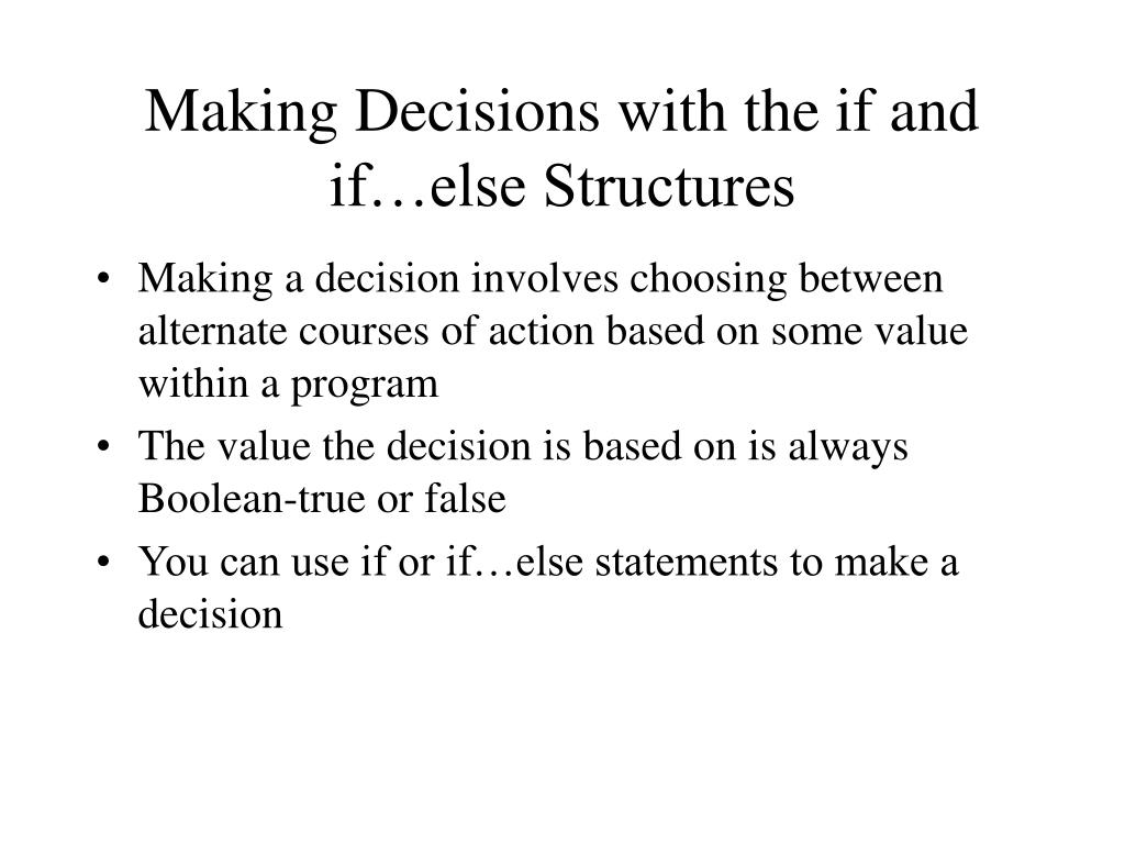 Making Decisions with the if and if…else Structures • Making a decision involves choosing between alternate courses of action based on some value within a program • The value the decision is based on is always Boolean-true or false • You can use if or if…else statements to make a decision