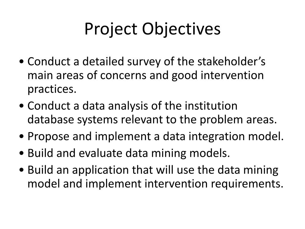 Project Objectives • Conduct a detailed survey of the stakeholder’s main areas of concerns and good intervention practices. • Conduct a data analysis of the institution database systems relevant to the problem areas. • Propose and implement a data integration model. • Build and evaluate data mining models. • Build an application that will use the data mining model and implement intervention requirements.