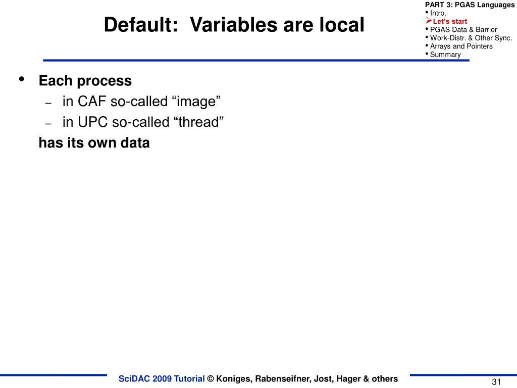 Default: Variables are local PART 3: PGAS Languages • Intro. • Let’s start • PGAS Data & Barrier • Work-Distr. & Other Sync. • Arrays and Pointers • Summary • Each process • in CAF so-called “image” • in UPC so-called “thread” has its own data 05/19/09, Author: Rolf Rabenseifner