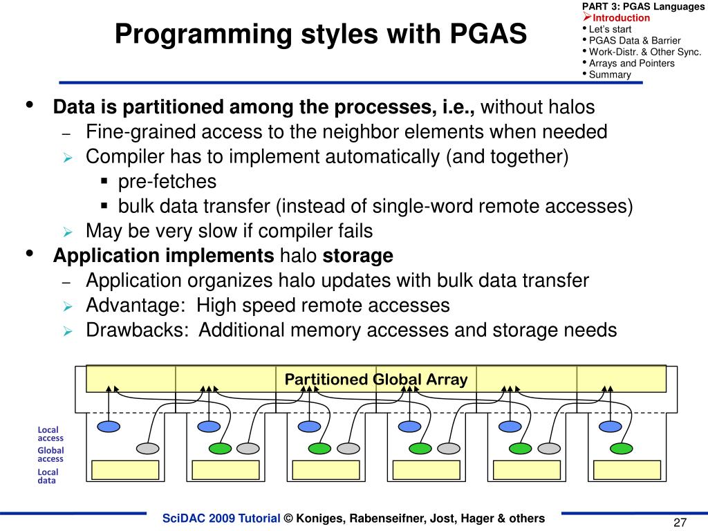Partitioned Global Address Space (PGAS) Languages PART 3: PGAS Languages • Introduction • Let’s start • PGAS Data & Barrier • Work-Distr. & Other Sync. • Arrays and Pointers • Summary • Principles: Partitioned Global Array Localaccess Globalaccess Localdata 05/19/09, Author: Rolf Rabenseifner