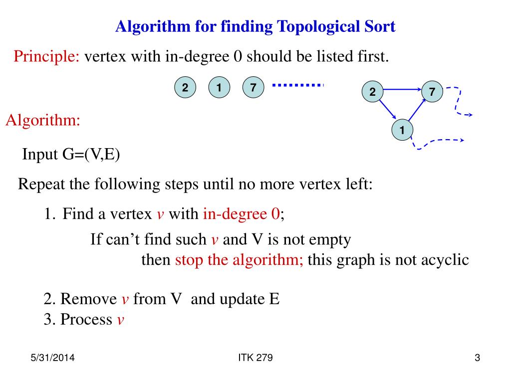 Algorithm for finding Topological Sort Principle: vertex with in-degree 0 should be listed first. 2 1 7 2 7 Algorithm: 1 Input G=(V,E) Repeat the following steps until no more vertex left: • Find a vertex vwith in-degree 0; If can’t find such vand V is not empty then stop the algorithm; this graph is not acyclic 2. Remove vfrom V and update E 3. Process v ITK 279