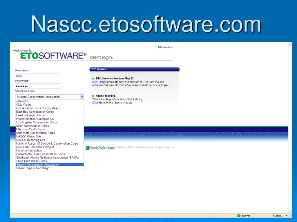 2 Sets of Usernames & Passwords Reporting on Crew Activities and Member Hours Username: scacl Password: scacl07 Completing Individual Member Assessments Username: SCAEvals Password: Evals07 Case sensitive Access to confidential and secured information in ETO