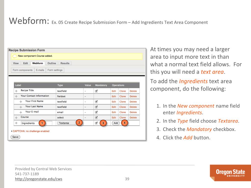 Webform: Ex. 05 Create Recipe Submission Form – Add Ingredients Text Area Component • At times you may need a larger area to input more text in than what a normal text field allows. For this you will need a text area. • To add the Ingredients text area component, do the following: • In the New component name field enter Ingredients. • In the Type field choose Textarea. • Check the Mandatory checkbox. • Click the Add button. 2 4 3 1