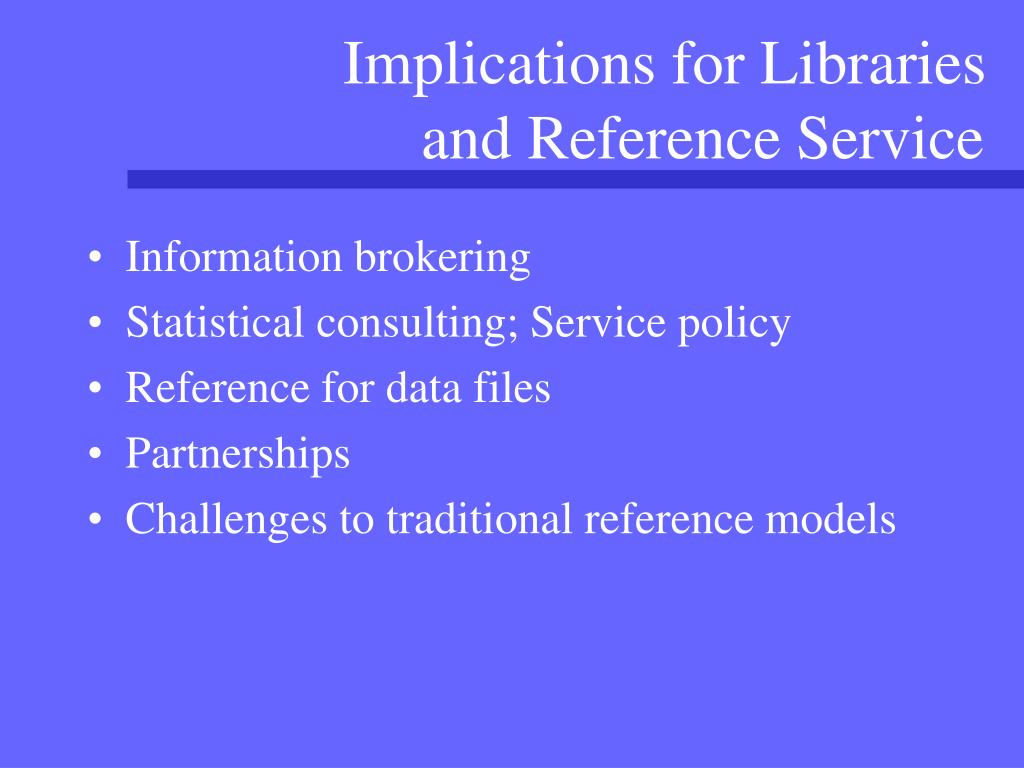 Implications for Libraries and Reference Service • Information brokering • Statistical consulting; Service policy • Reference for data files • Partnerships • Challenges to traditional reference models