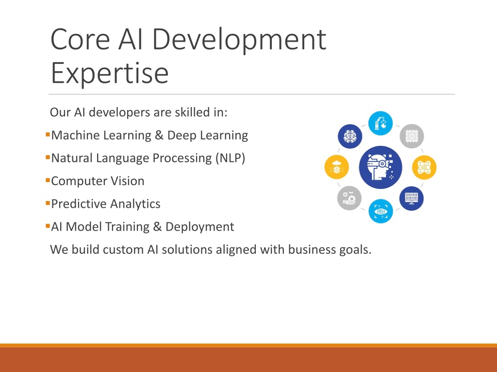 Core AI Development Expertise • Our AI developers are skilled in: • Machine Learning & Deep Learning • Natural Language Processing (NLP) • Computer Vision • Predictive Analytics • AI Model Training & Deployment • We build custom AI solutions aligned with business goals.