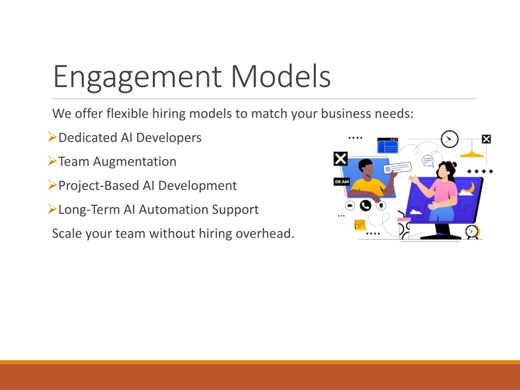 Engagement Models • We offer flexible hiring models to match your business needs: • Dedicated AI Developers • Team Augmentation • Project-Based AI Development • Long-Term AI Automation Support • Scale your team without hiring overhead.