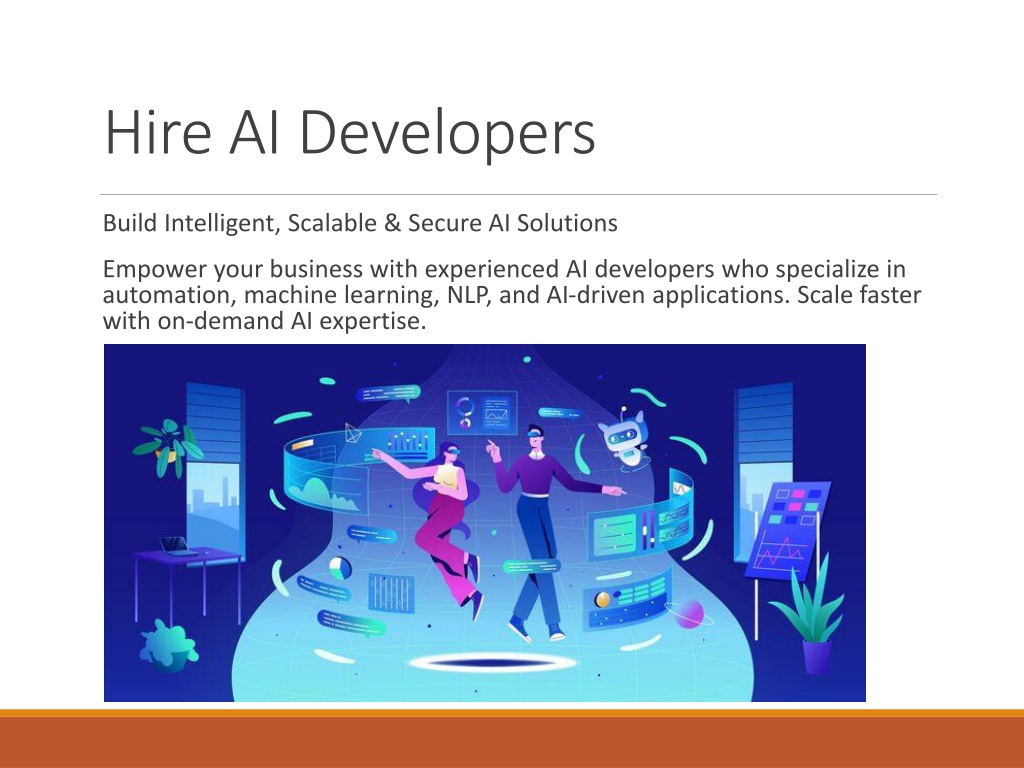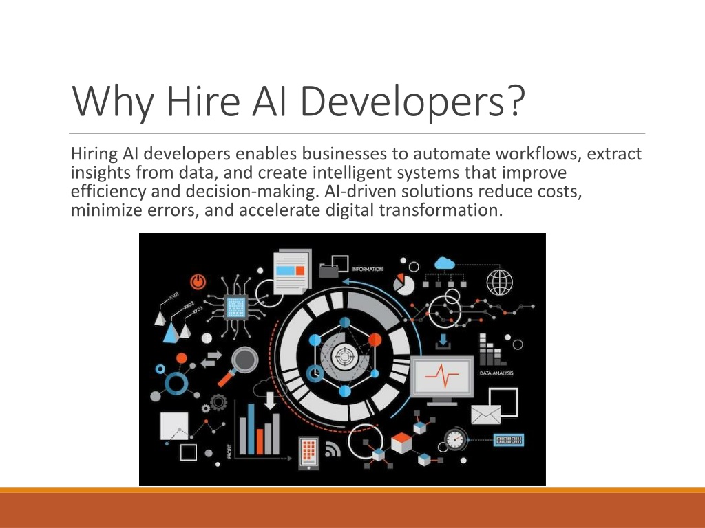 Why Hire AI Developers? • Hiring AI developers enables businesses to automate workflows, extract insights from data, and create intelligent systems that improve efficiency and decision-making. AI-driven solutions reduce costs, minimize errors, and accelerate digital transformation.