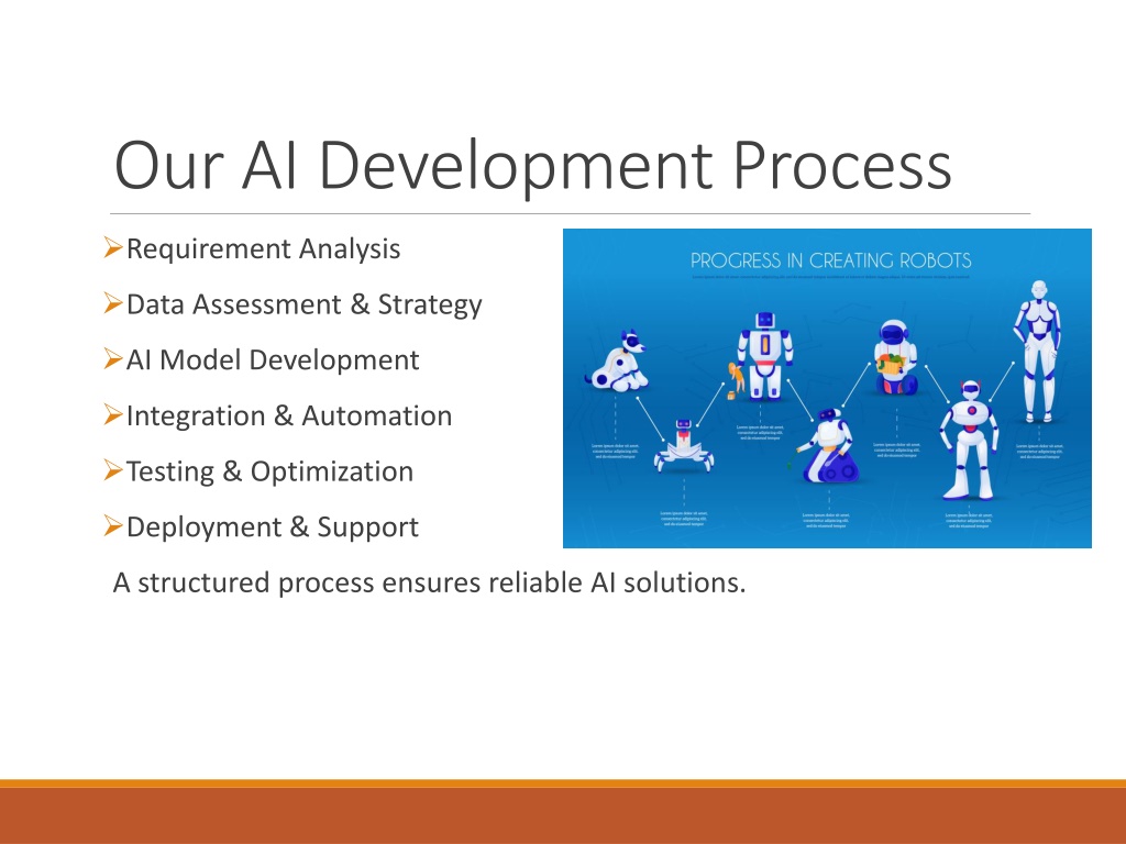 Our AI Development Process • Requirement Analysis • Data Assessment & Strategy • AI Model Development • Integration & Automation • Testing & Optimization • Deployment & Support • A structured process ensures reliable AI solutions.