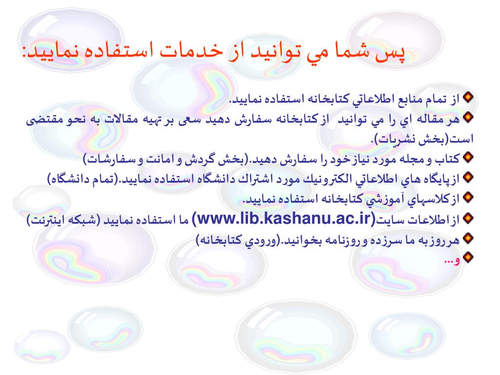 پس شما مي توانيد از خدمات استفاده نماييد: • ازتمام منابع اطلاعاتي كتابخانه استفاده نماييد. • هر مقاله اي را مي توانيد از كتابخانه سفارش دهيد سعی بر تهیه مقالات به نحو مقتضی است(بخش نشريات). • كتاب و مجله مورد نياز خود را سفارش دهيد.(بخش گردش و امانت و سفارشات) • از پايگاه هاي اطلاعاتي الكترونيك مورد اشتراك دانشگاه استفاده نماييد.(تمام دانشگاه) • از كلاسهاي آموزشي كتابخانه استفاده نماييد. • از اطلاعات سايت(www.lib.kashanu.ac.ir) ما استفاده نماييد (شبكه اينترنت) • هر روز به ما سرزده و روزنامه بخوانيد.(ورودي كتابخانه) • و...