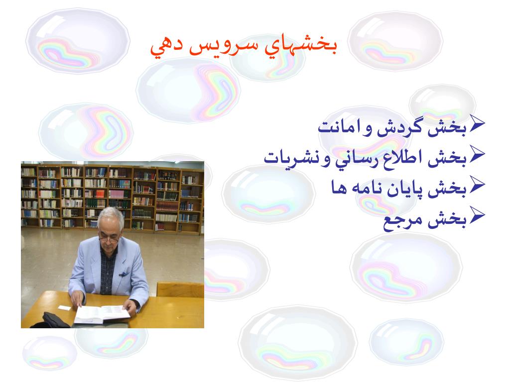 بخشهاي سرويس دهي • بخش گردش و امانت • بخش اطلاع رساني و نشريات • بخش پايان نامه ها • بخش مرجع