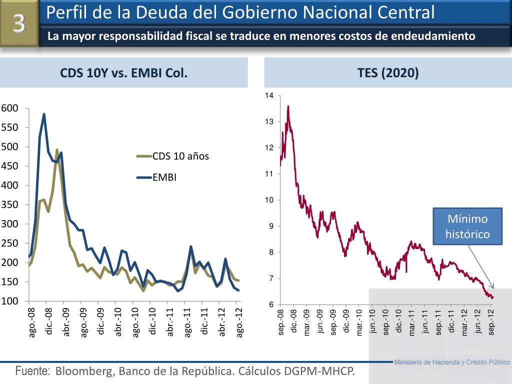 La mayor responsabilidad fiscal se traduce en menores costos de endeudamiento Perfil de la Deuda del Gobierno Nacional Central 3 TES (2020) Bloomberg, Banco de la República. Cálculos DGPM-MHCP. CDS 10Y vs. EMBI Col. Mínimo histórico