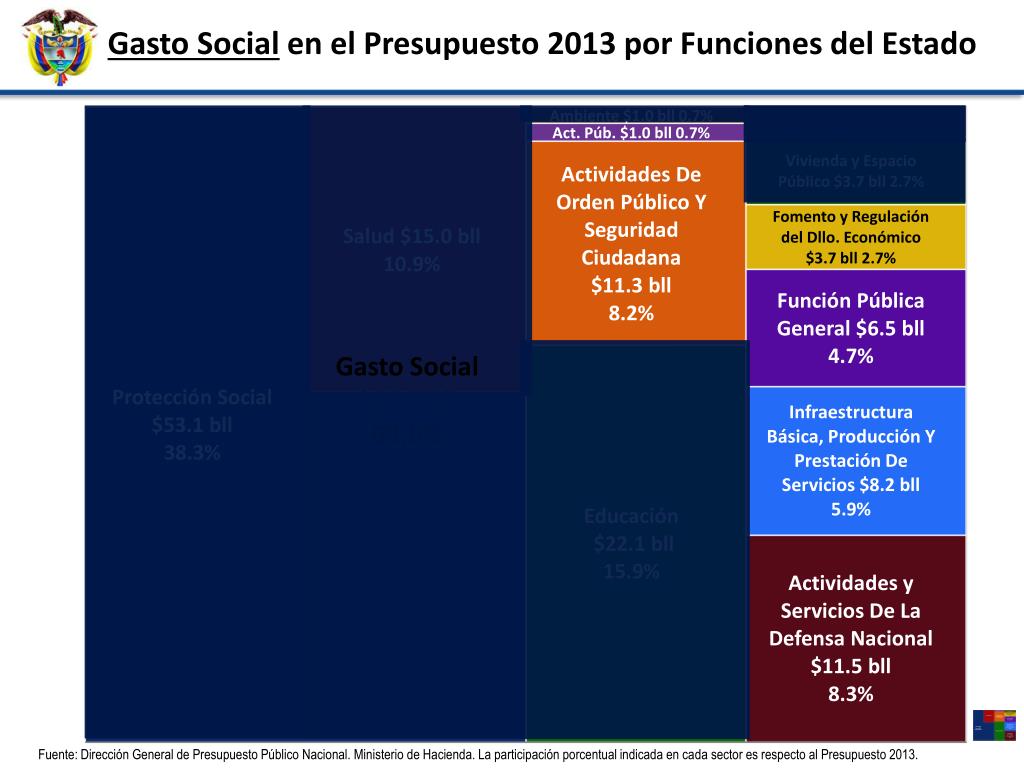 Gasto Social en el Presupuesto 2013 por Funciones del Estado Gasto Social $96.5 bll 69.6% Fuente: Dirección General de Presupuesto Público Nacional. Ministerio de Hacienda. La participación porcentual indicada en cada sector es respecto al Presupuesto 2013.