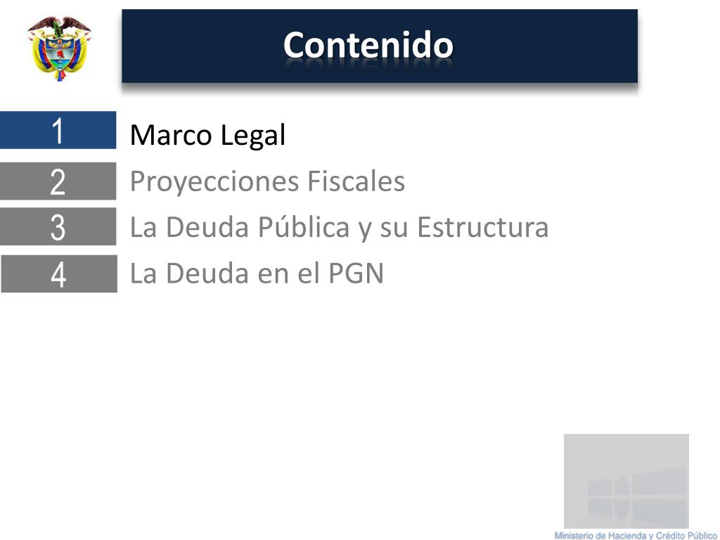 DEUDA PÚBLICA EN COLOMBIA. MINISTERIO DE HACIENDA Y CREDITO PUBLICO DE COLOMBIA Bogotá octubre 2012. Deuda Pública en Colombia. Ministerio de Hacienda y Crédito Público. Octubrede 2012. Contenido. Marco Legal Proyecciones Fiscales La Deuda Pública y su Estructura La Deuda en el PGN. 1.