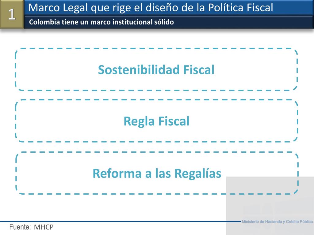 Colombia tiene un marco institucional sólido Marco Legal que rige el diseño de la Política Fiscal 1 MHCP Sostenibilidad Fiscal Regla Fiscal Reforma a lasRegalías