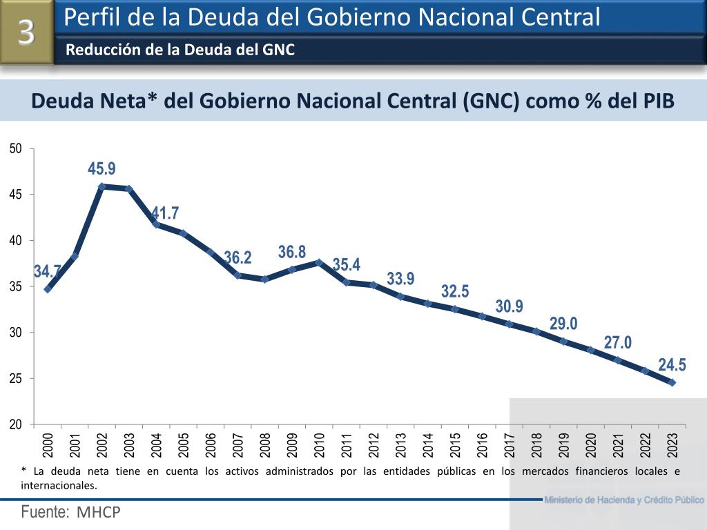 Reducción de la Deuda del GNC Perfil de la Deuda del Gobierno Nacional Central 3 MHCP Deuda Neta* del Gobierno Nacional Central (GNC) como % del PIB * La deuda neta tiene en cuenta los activos administrados por las entidades públicas en los mercados financieros locales e internacionales.