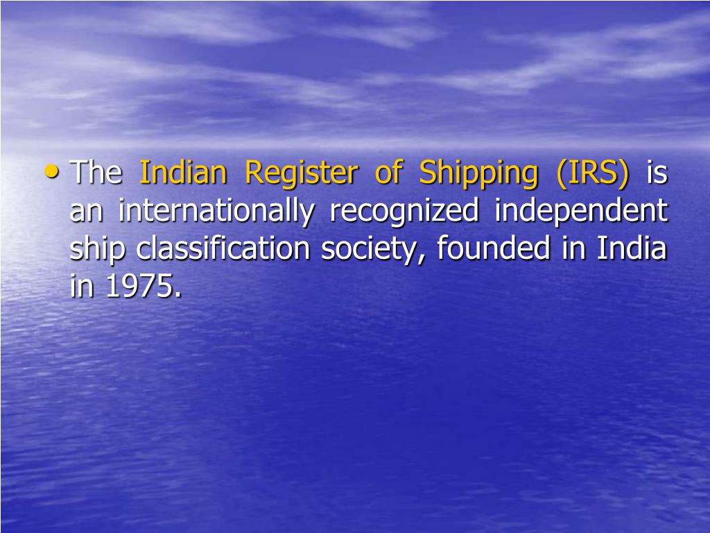 The Indian Register of Shipping (IRS) is an internationally recognized independent ship classification society, founded in India in 1975.