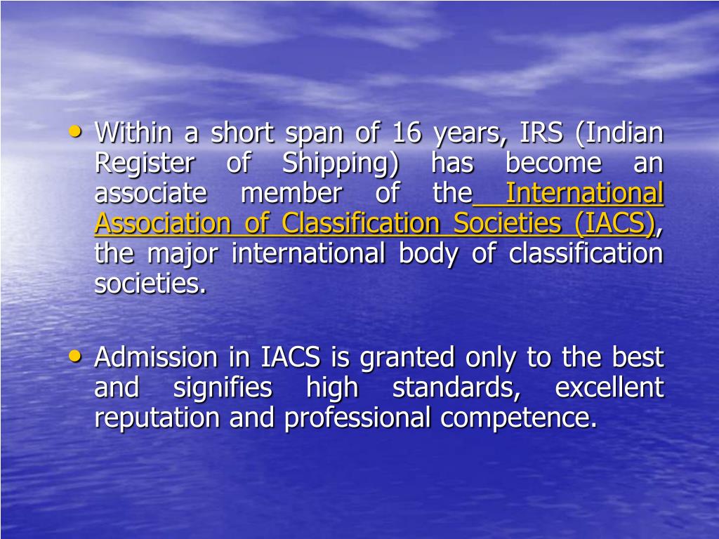 Within a short span of 16 years, IRS (Indian Register of Shipping) has become an associate member of the International Association of Classification Societies (IACS), the major international body of classification societies. • Admission in IACS is granted only to the best and signifies high standards, excellent reputation and professional competence.