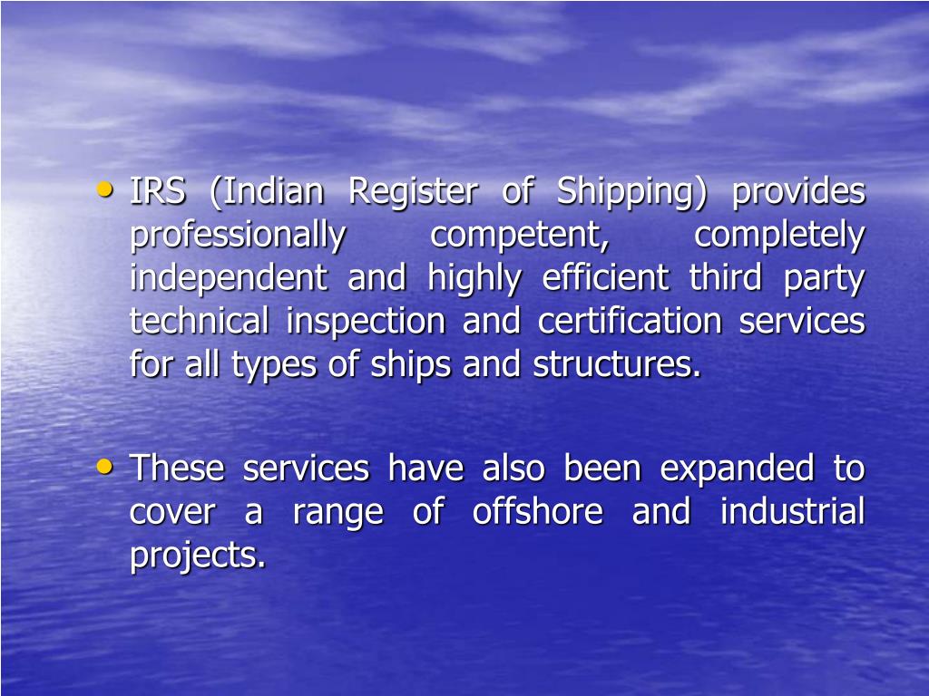 IRS (Indian Register of Shipping) provides professionally competent, completely independent and highly efficient third party technical inspection and certification services for all types of ships and structures. • These services have also been expanded to cover a range of offshore and industrial projects.