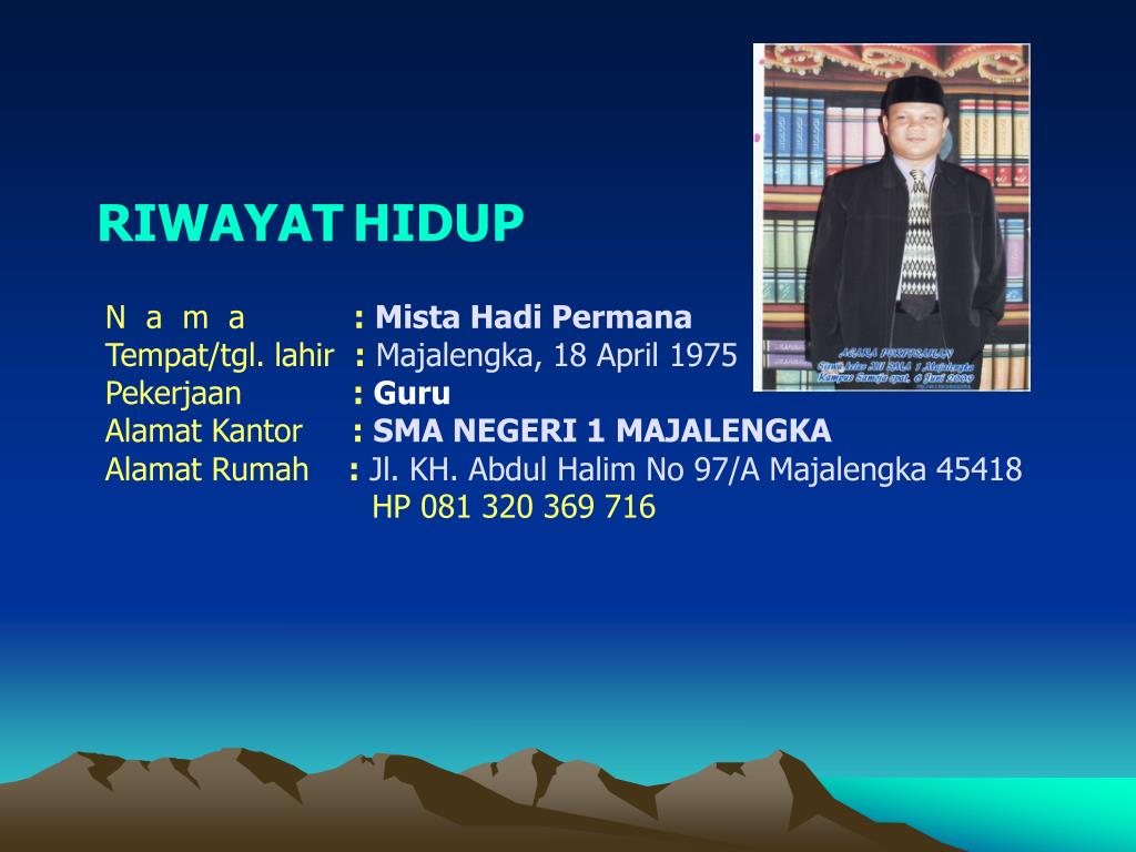 RIWAYATHIDUP N a m a :Mista Hadi Permana Tempat/tgl. lahir:Majalengka, 18April 1975 Pekerjaan :Guru Alamat Kantor :SMA NEGERI 1 MAJALENGKA Alamat Rumah :Jl. KH. Abdul HalimNo 97/A Majalengka 45418 HP 081 320 369 716