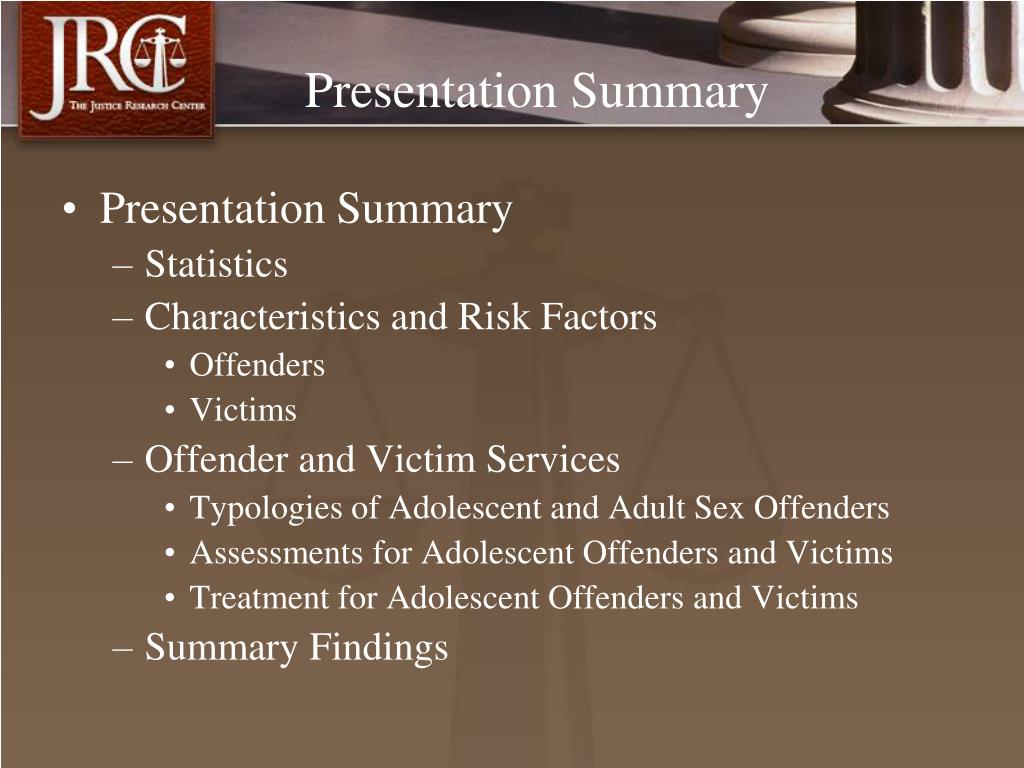 Presentation Summary • Presentation Summary • Statistics • Characteristics and Risk Factors • Offenders • Victims • Offender and Victim Services • Typologies of Adolescent and Adult Sex Offenders • Assessments for Adolescent Offenders and Victims • Treatment for Adolescent Offenders and Victims • Summary Findings