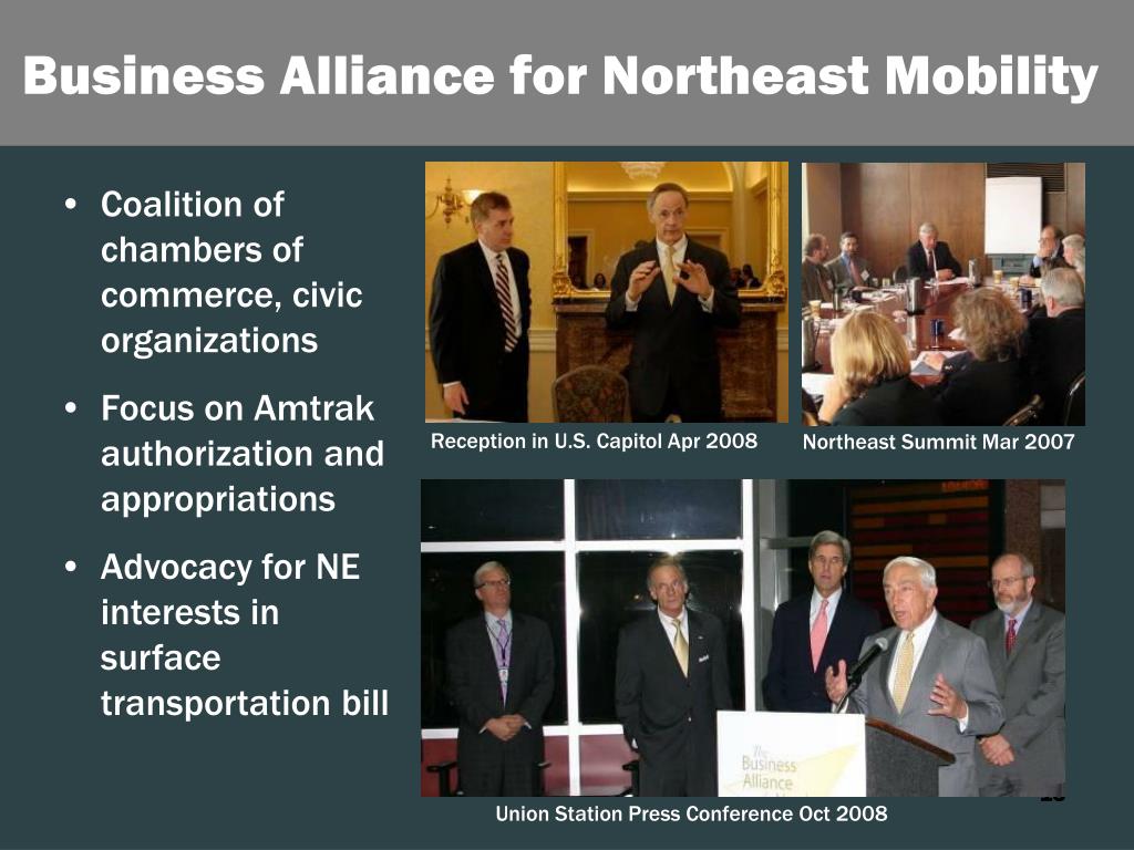 Business Alliance for Northeast Mobility • Coalition of chambers of commerce, civic organizations • Focus on Amtrak authorization and appropriations • Advocacy for NE interests in surface transportation bill Reception in U.S. Capitol Apr 2008 Northeast Summit Mar 2007 Union Station Press Conference Oct 2008