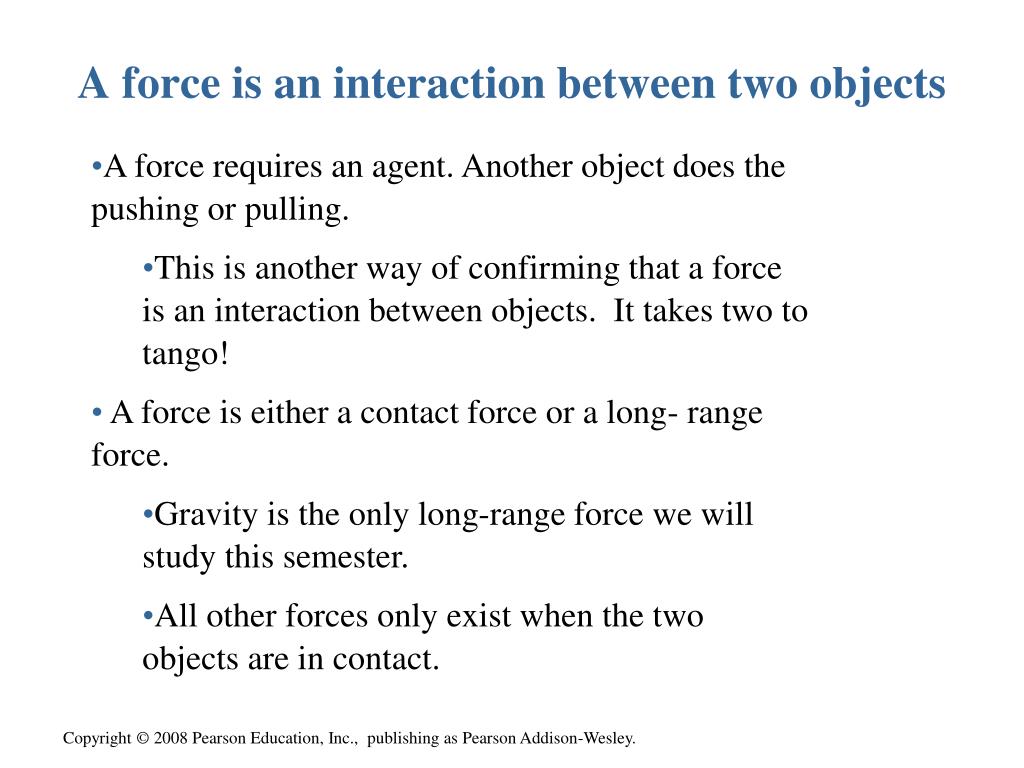 A force is an interaction between two objects • A force requires an agent. Another object does the pushing or pulling. • This is another way of confirming that a force is an interaction between objects. It takes two to tango! • A force is either a contact force or a long- range force. • Gravity is the only long-range force we will study this semester. • All other forces only exist when the two objects are in contact.