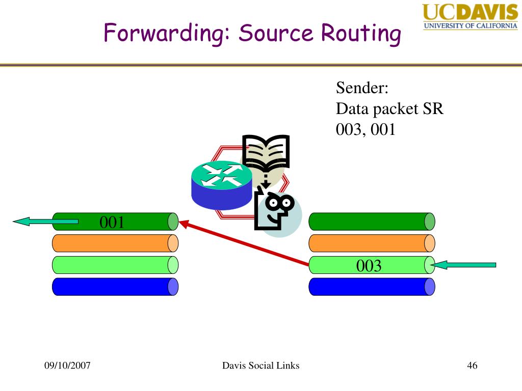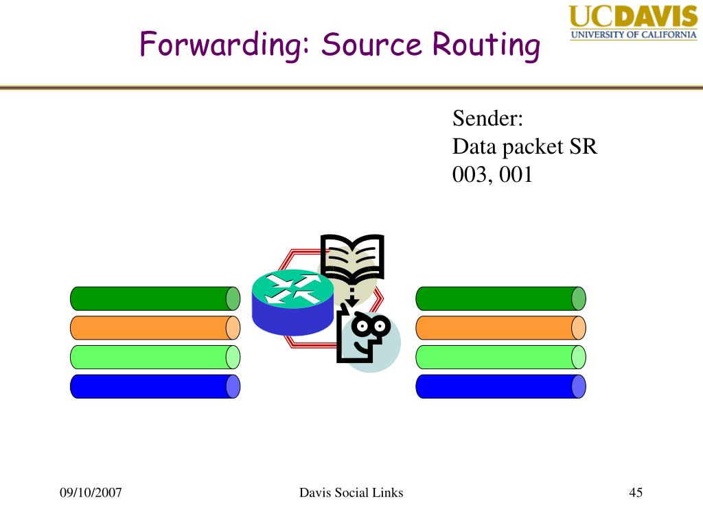 Forwarding: Source Routing Sender: Data packet SR 003, 001 Davis Social Links