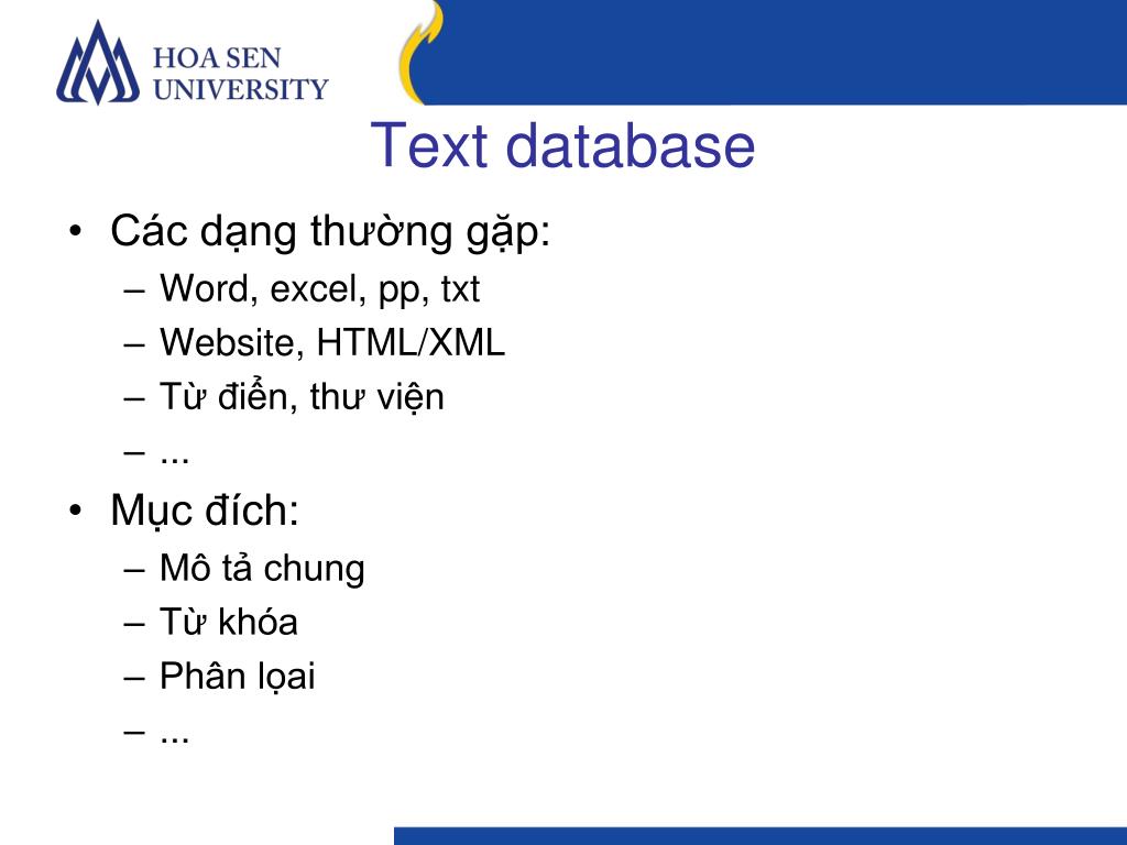 Text database • Các dạng thường gặp: • Word, excel, pp, txt • Website, HTML/XML • Từ điển, thư viện • ... • Mục đích: • Mô tả chung • Từ khóa • Phân lọai • ...