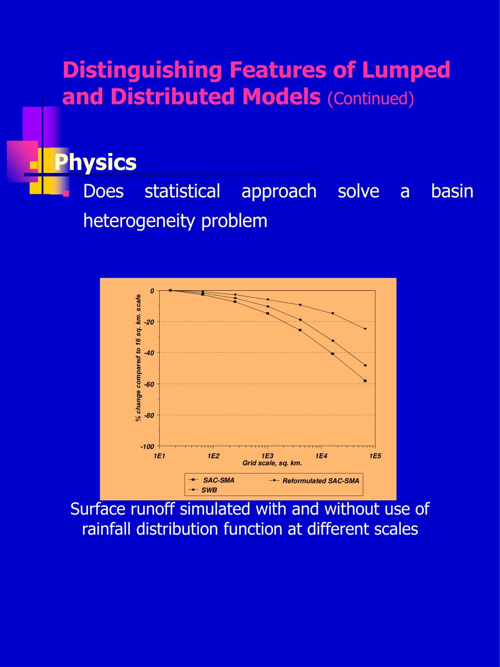 Distinguishing Features of Lumped and Distributed Models (Continued) • Physics • Does statistical approach solve a basin heterogeneity problem Surface runoff simulated with and without use of rainfall distribution function at different scales