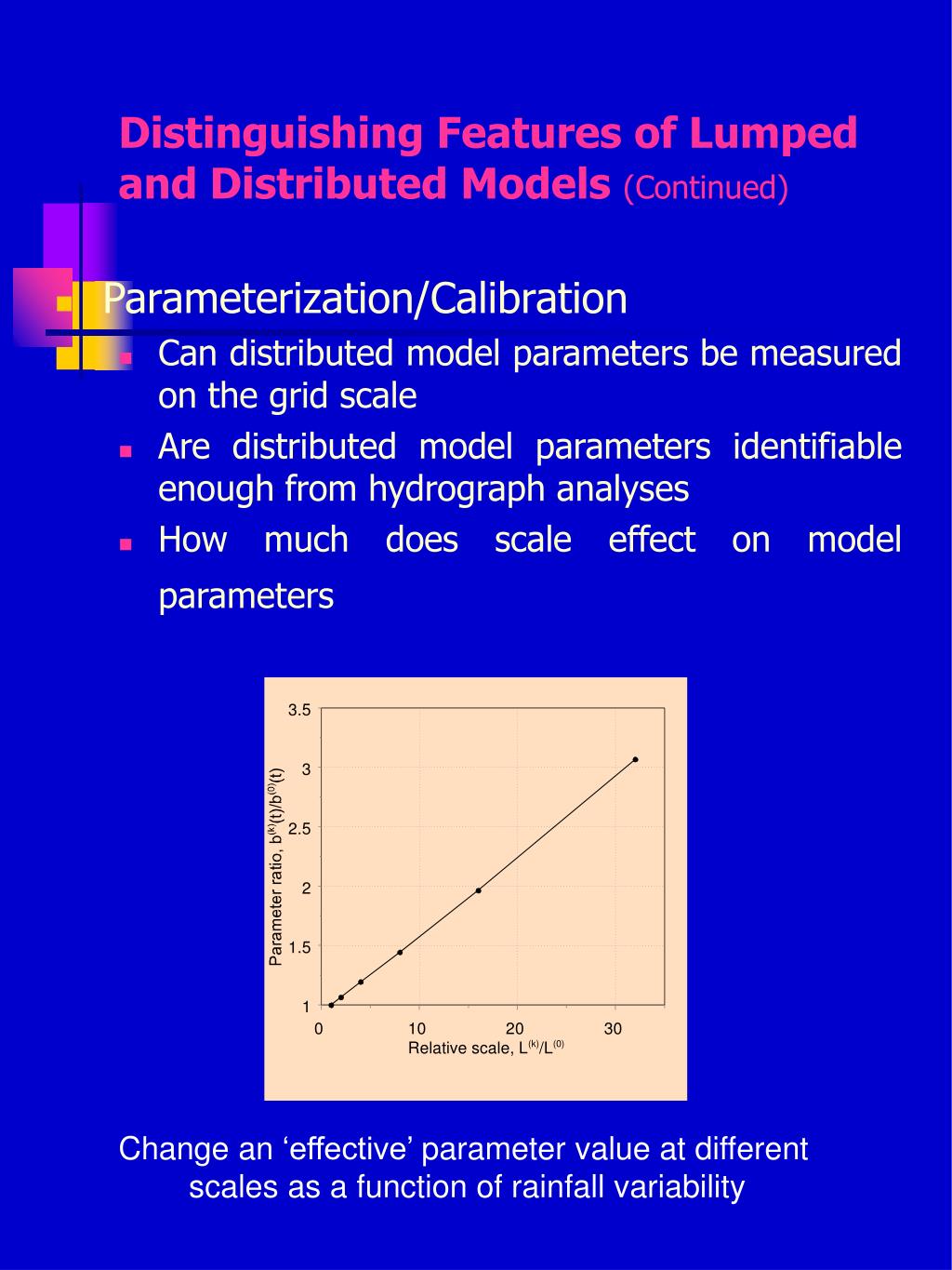 Distinguishing Features of Lumped and Distributed Models (Continued) • Parameterization/Calibration • Can distributed model parameters be measured on the grid scale • Are distributed model parameters identifiable enough from hydrograph analyses • How much does scale effect on model parameters Change an ‘effective’ parameter value at different scales as a function of rainfall variability