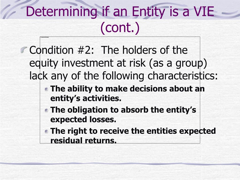 Determining if an Entity is a VIE (cont.) • Condition #2: The holders of the equity investment at risk (as a group) lack any of the following characteristics: • The ability to make decisions about an entity’s activities. • The obligation to absorb the entity’s expected losses. • The right to receive the entities expected residual returns.