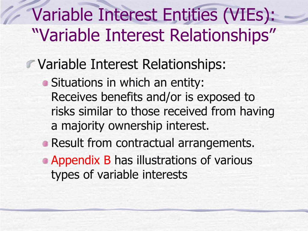 Variable Interest Entities (VIEs):“Variable Interest Relationships” • Variable Interest Relationships: • Situations in which an entity:Receives benefits and/or is exposed to risks similar to those received from having a majority ownership interest. • Result from contractual arrangements. • Appendix B has illustrations of various types of variable interests