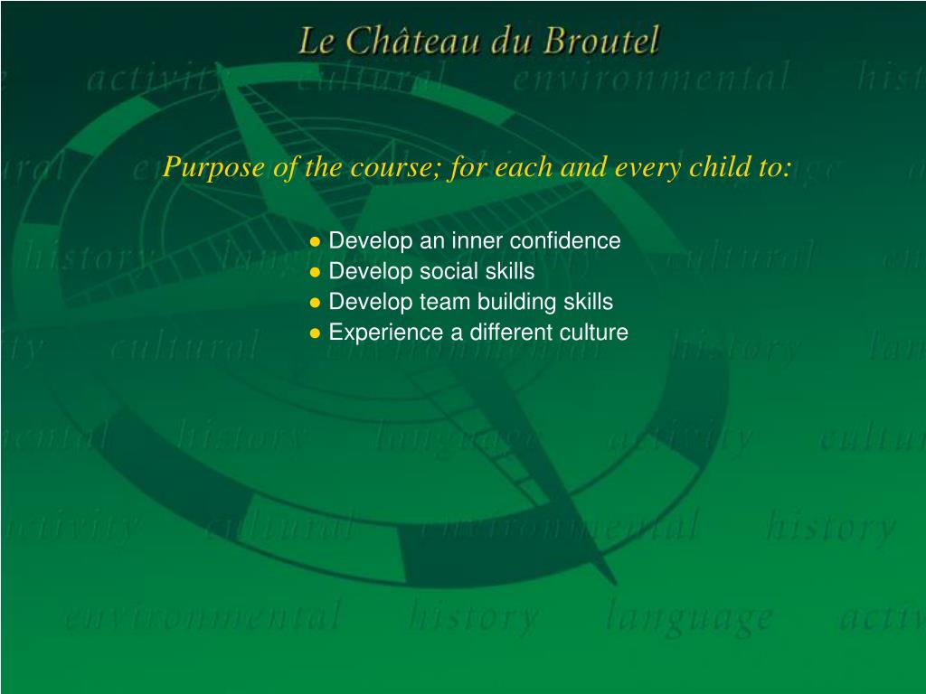 Purpose of the course; for each and every child to: ● Develop an inner confidence ● Develop social skills ● Develop team building skills ● Experience a different culture
