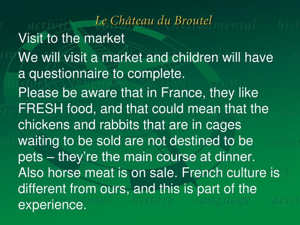 Visit to the market We will visit a market and children will have a questionnaire to complete. Please be aware that in France, they like FRESH food, and that could mean that the chickens and rabbits that are in cages waiting to be sold are not destined to be pets – they’re the main course at dinner. Also horse meat is on sale. French culture is different from ours, and this is part of the experience.