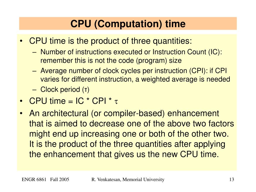 CPU (Computation) time • CPU time is the product of three quantities: • Number of instructions executed or Instruction Count (IC): remember this is not the code (program) size • Average number of clock cycles per instruction (CPI): if CPI varies for different instruction, a weighted average is needed • Clock period (τ) • CPU time = IC * CPI * t • An architectural (or compiler-based) enhancement that is aimed to decrease one of the above two factors might end up increasing one or both of the other two. It is the product of the three quantities after applying the enhancement that gives us the new CPU time. R. Venkatesan, Memorial University