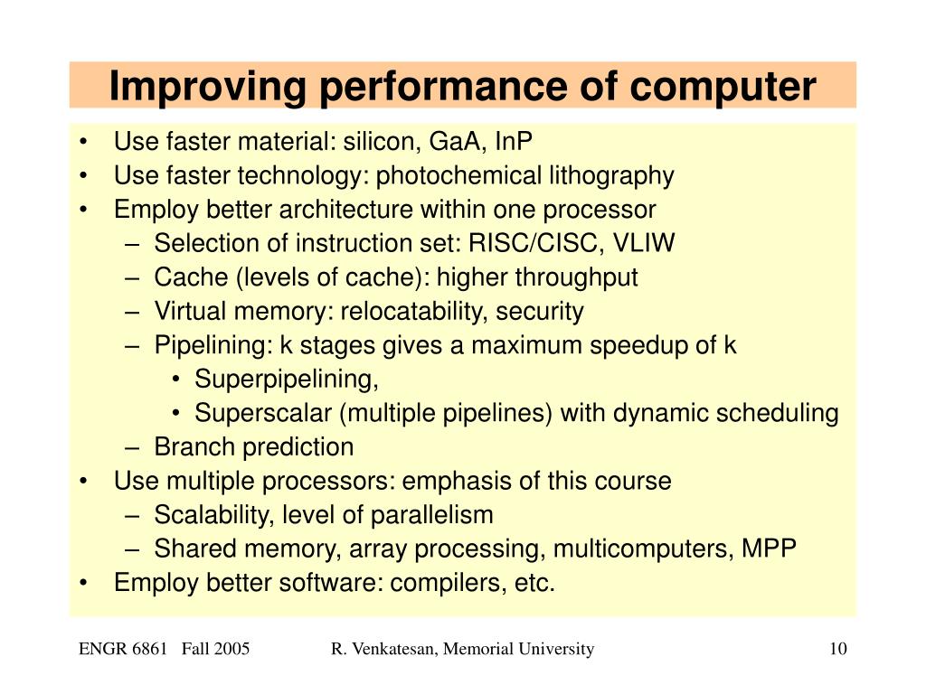 Improving performance of computer • Use faster material: silicon, GaA, InP • Use faster technology: photochemical lithography • Employ better architecture within one processor • Selection of instruction set: RISC/CISC, VLIW • Cache (levels of cache): higher throughput • Virtual memory: relocatability, security • Pipelining: k stages gives a maximum speedup of k • Superpipelining, • Superscalar (multiple pipelines) with dynamic scheduling • Branch prediction • Use multiple processors: emphasis of this course • Scalability, level of parallelism • Shared memory, array processing, multicomputers, MPP • Employ better software: compilers, etc. R. Venkatesan, Memorial University