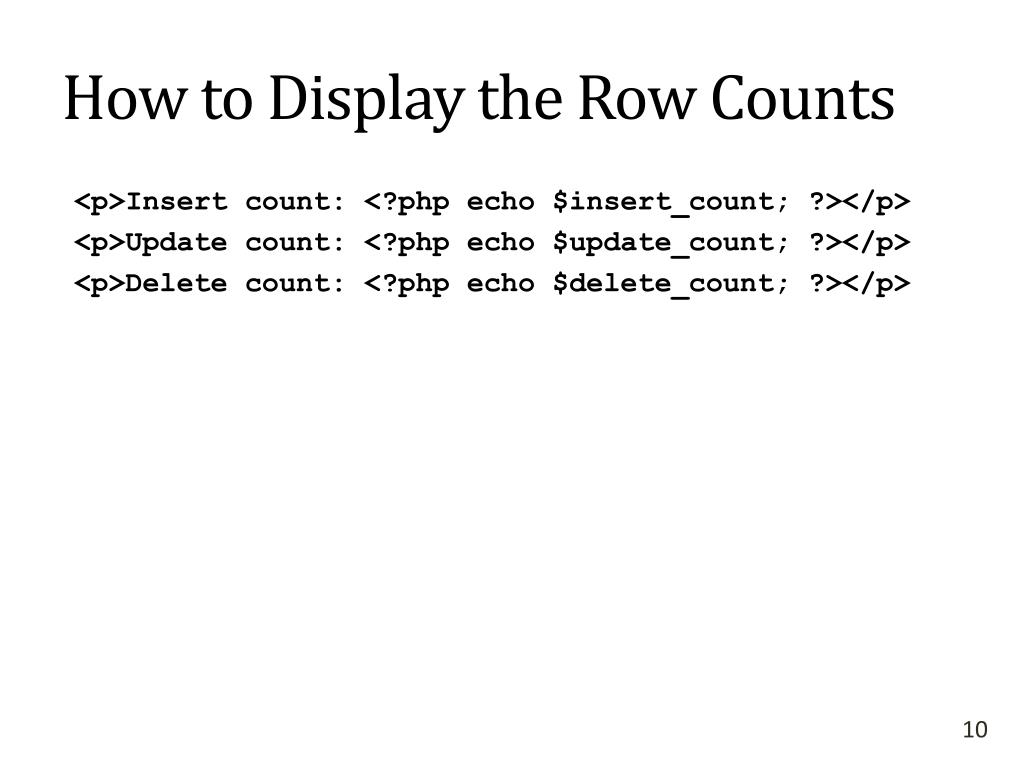 How to Display the Row Counts <p>Insert count: <?php echo $insert_count; ?></p> <p>Update count: <?php echo $update_count; ?></p> <p>Delete count: <?php echo $delete_count; ?></p>
