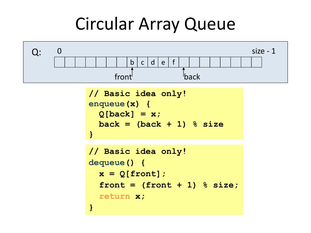 Circular Array Queue Q: 0 size - 1 b c d e f back front // Basic idea only! enqueue(x) { Q[back] = x; back = (back + 1) % size } • // Basic idea only! • dequeue() { • x = Q[front]; • front = (front + 1) % size; • return x; • }