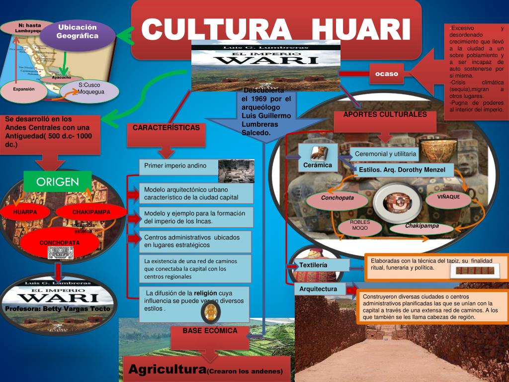 CULTURA HUARI. N: hasta Lambayeque. Ubicación Geográfica. - Excesivo y desordenado crecimiento que llevó a la ciudad a un sobre poblamiento y a ser incapaz de auto sostenerse por si misma. -Crisis climática (sequia),migran a otros lugares. -Pugna de poderes al interior del imperio. ocaso.