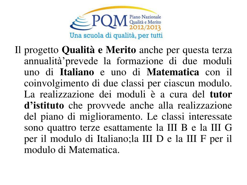 Il progetto Qualità e Merito anche per questa terza annualità’prevede la formazione di due moduli uno di Italiano e uno di Matematica con il coinvolgimento di due classi per ciascun modulo. La realizzazione dei moduli è a cura del tutord’istituto che provvede anche alla realizzazione del piano di miglioramento. Le classi interessate sono quattro terze esattamente la III B e la III G per il modulo di Italiano;la III D e la III F per il modulo di Matematica.