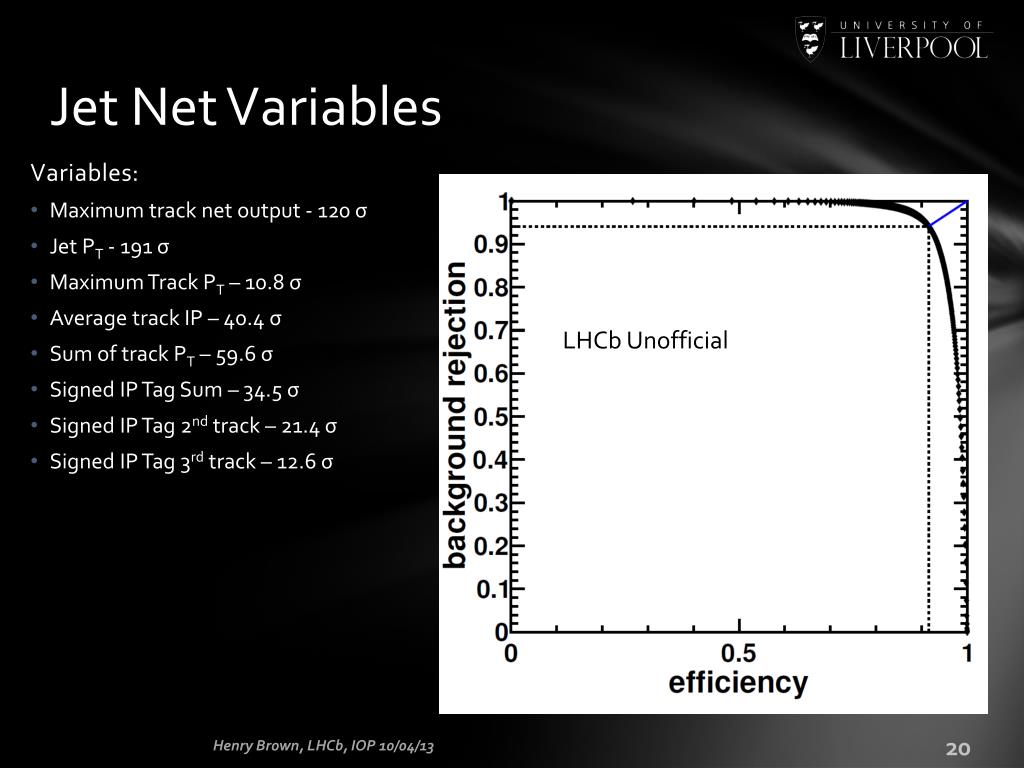 Jet Net Variables • Variables: • Maximum track net output - 120 σ • Jet PT - 191σ • Maximum Track PT – 10.8σ • Average track IP – 40.4σ • Sum of track PT – 59.6 σ • Signed IP Tag Sum – 34.5σ • Signed IP Tag 2nd track – 21.4σ • Signed IP Tag 3rd track – 12.6 σ LHCb Unofficial Henry Brown, LHCb, IOP 10/04/13
